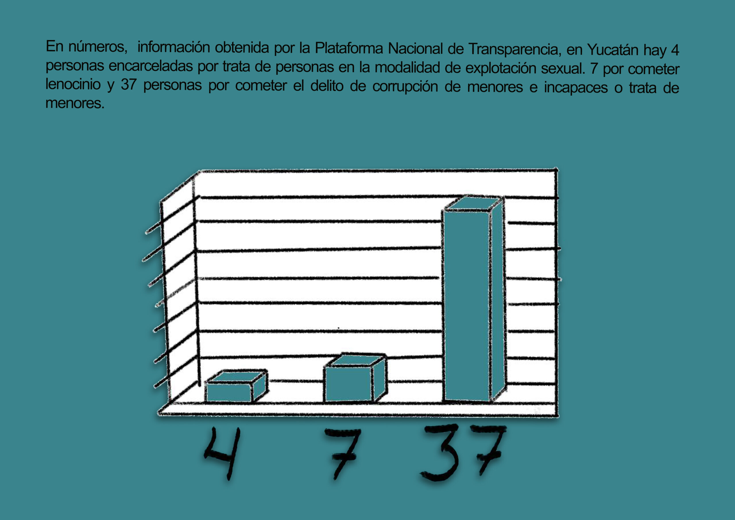 En los últimos seis años, de 2018 a lo que va de 2024, la FGE de Yucatán no ha recibido ninguna denuncia por el delito de trata de personas en la modalidad de explotación. Lo que refleja lo complejo que es denunciar, perseguir y desarticular este tipo de redes. De los delitos de corrupción de menores, trata de menores y pornografía infantil —suscritos en el artículo 208 del Código Penal del Estado de Yucatán—, sí hay carpetas judicializadas con personas vinculadas a proceso. Se registraron 18 imputados por cometer corrupción de menores, 4 por trata de menores y 3 por pornografía infantil.