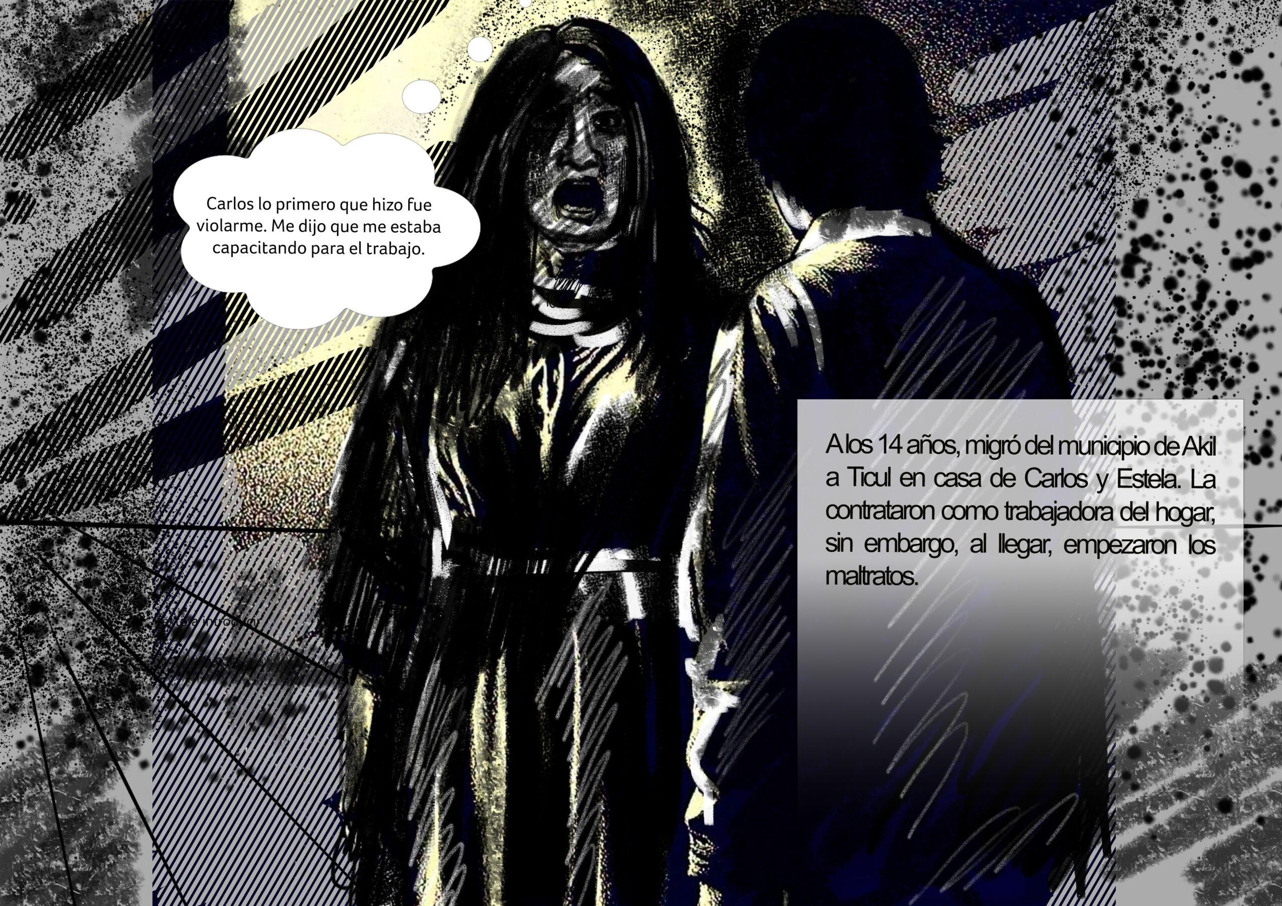 Cuando Estela la recibió, le pidió a Ana y Magdalena, sus hermanas, que la vistan con una falda corta y blusa de tirantes, a la par, le gritó que tendría que acostarse con muchos hombres. María se intentó defender, pero recibió una bofetada. En ese momento, intervino Carlos y la violó.