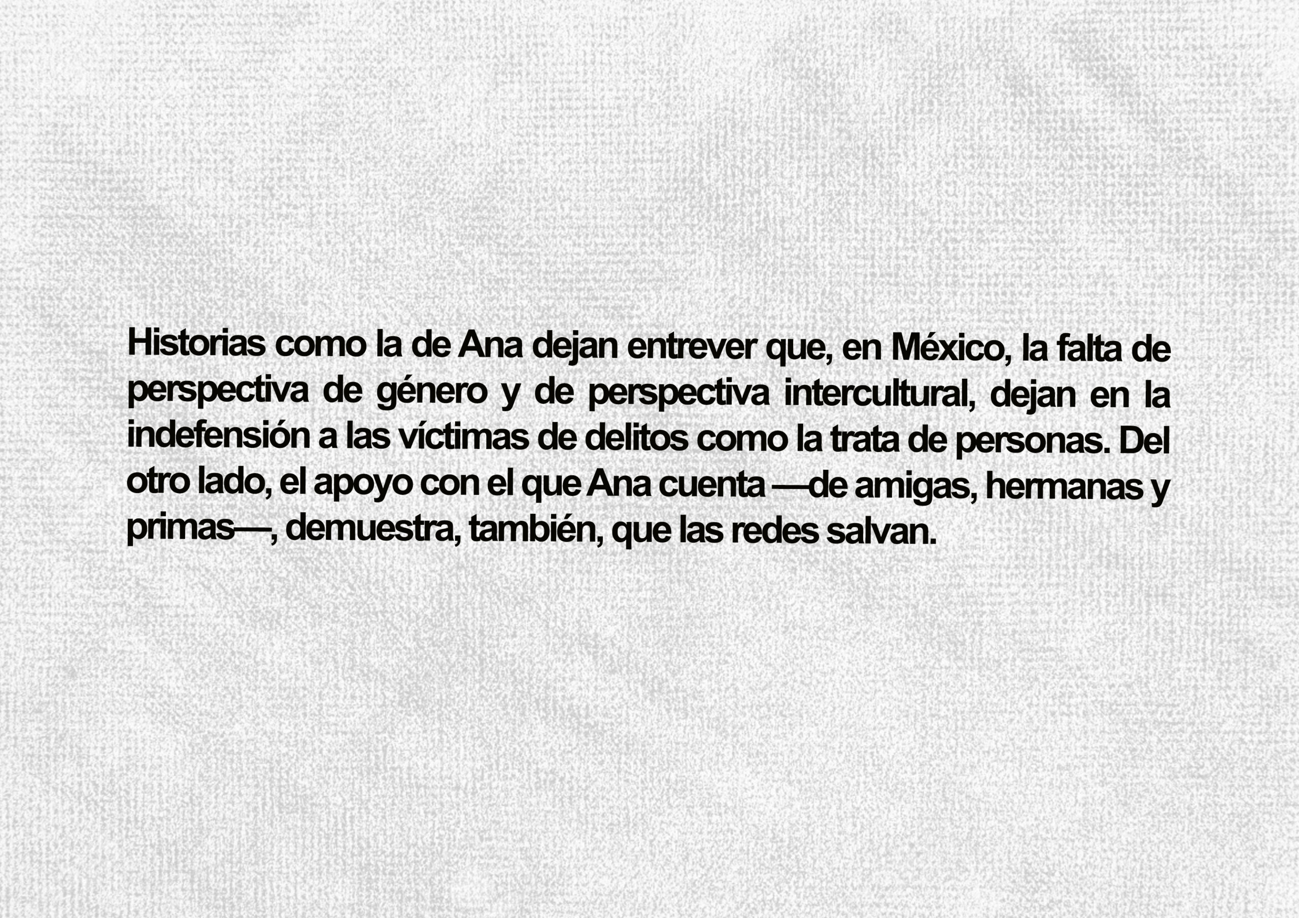 Historias como la de Ana dejan entrever que, en México, la falta de perspectiva de género y de perspectiva intercultural, dejan en la indefensión a las víctimas de delitos como la trata de personas. Del otro lado, el apoyo con el que Ana cuenta —de amigas, hermanas y primas—, demuestra, también, que las redes salvan.