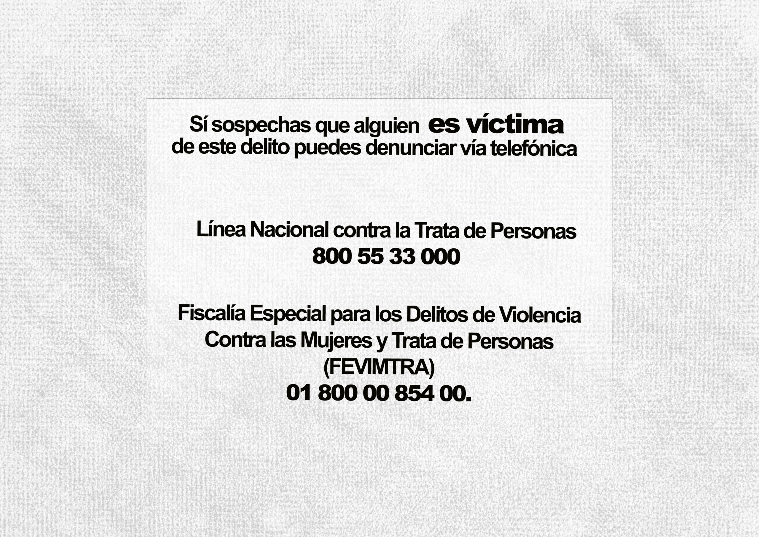 El reporte de 2023-2024 de la línea telefónica para denunciar la trata de personas del Consejo Ciudadano para la Seguridad y Justicia de la Ciudad de México, recibió 29 solicitudes de auxilio del estado de Yucatán. Y, aunque es un delito difícil de detectar, en México hay formas anónimas para denunciarlo. Una opción es el 800 55 33 000 que corresponde a la Línea Nacional contra la Trata de Personas. Otra, es la Fiscalía Especial para los Delitos de Violencia Contra las Mujeres y Trata de Personas (FEVIMTRA) cuya línea 01 800 00 854 00 funciona las 24 horas del día.