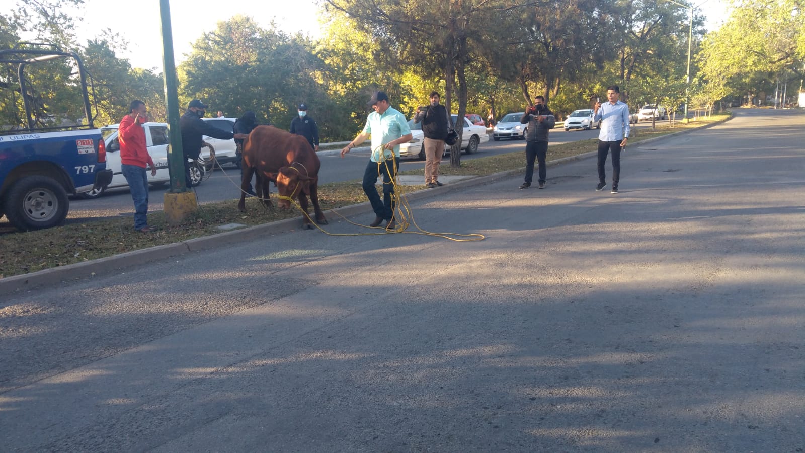 Después de escapar de un predio ubicado en la Colonia Altavista el torete recorrió la Calzada General Luis Caballero “escoltado” por una patrulla de la Policía Estatal y elementos de la Policía Montada.