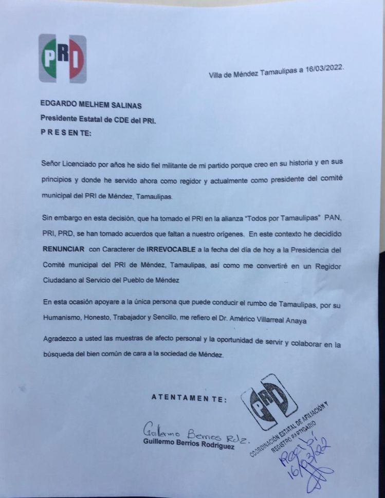 “Esta decisión que ha tomado el PRI en la alianza “Todos Por Tamaulipas, PAN, PRI, PRD, se han tomado acuerdos que faltan a nuestros orígenes. En este contexto, he decidido renunciar a la presidencia del comité municipal del PRI en Méndez Tamaulipas, así como me convertiré en un regidor ciudadano al servicio del pueblo del municipio antes referido”, expresó .