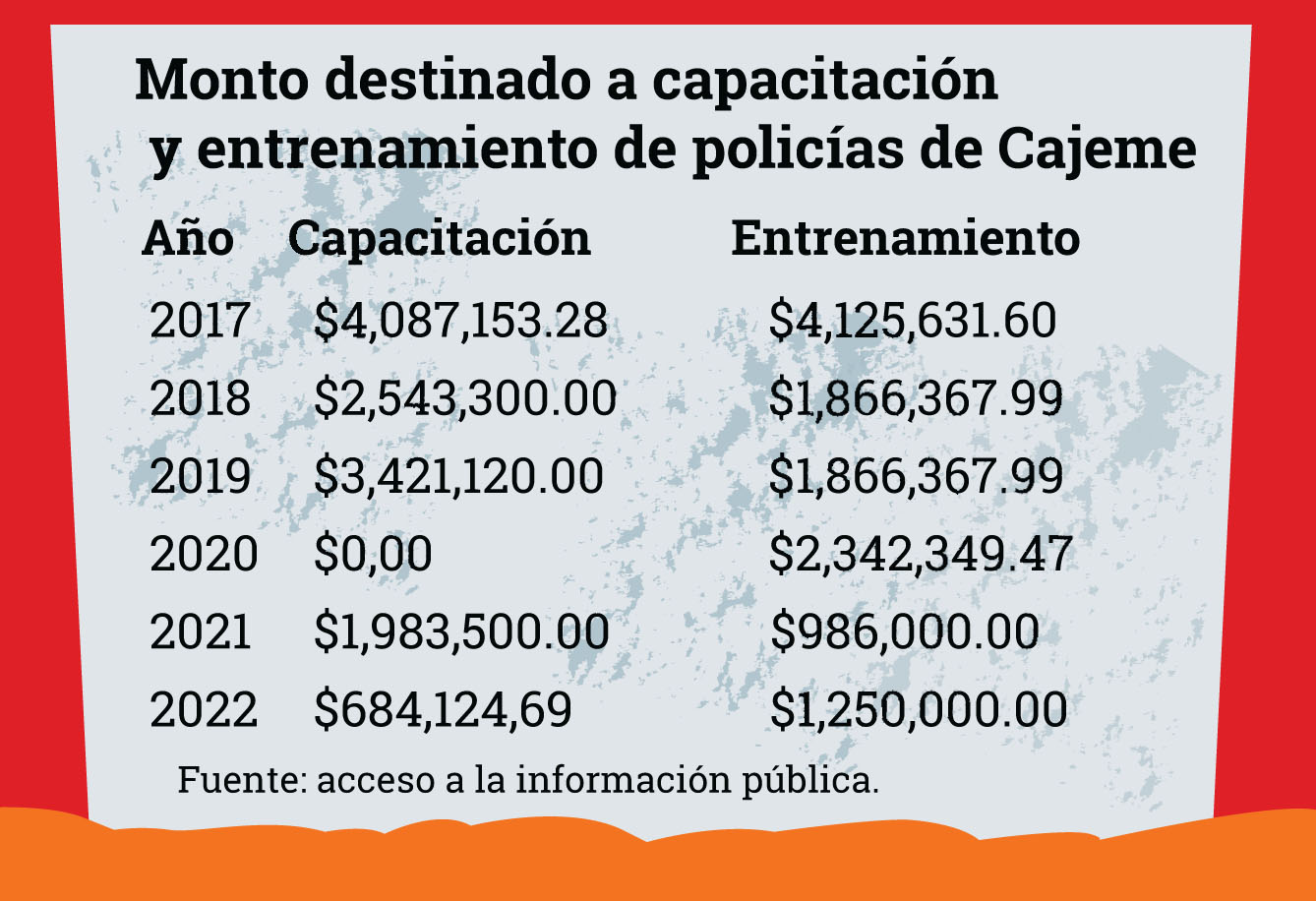 El monto destinado a capacitación de agentes policiacos en Cajeme ha disminuido con los años, siendo 2020 el año en que no se recibió recurso. Crédito: Carlos Mendoza