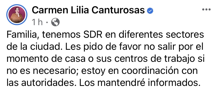 “Familia, tenemos SDR en diferentes sectores de la ciudad. Les pido de favor no salir por el momento de casa o sus centros de trabajo si no es necesario; estoy en coordinación con las autoridades. Los mantendré informados”, posteó la alcaldesa en sus redes sociales.