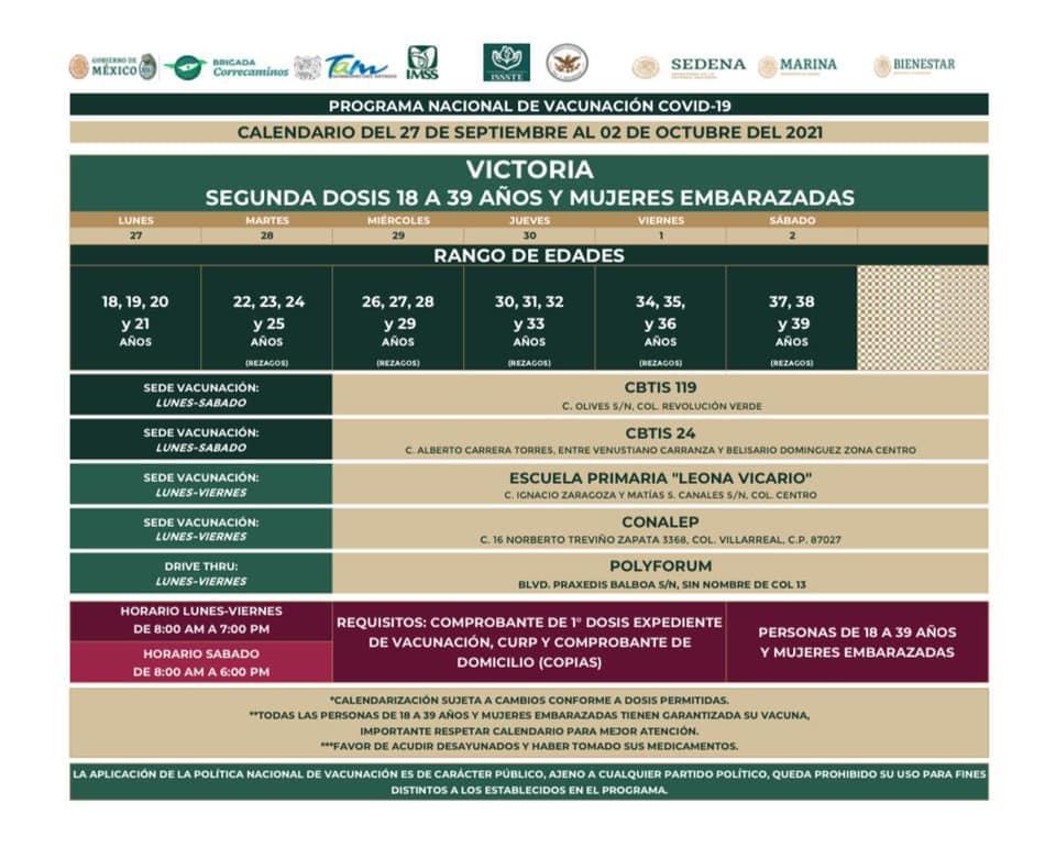 VICTORIA, Tam.- A partir del próximo lunes 27 de septiembre inicia en esta ciudad la aplicación de la segunda dosis de la vacuna contra COVID-19 para jóvenes de 18 años, informó el delegado de Programas Federales para el Desarrollo en Tamaulipas José Ramón Gómez Leal.