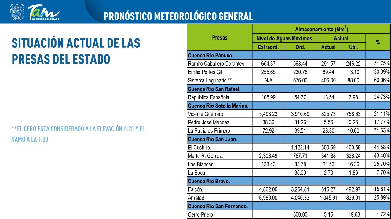 Asimismo previo al inicio de la temporada de verano, la capacidad de reserva de agua en el estado es crítica, pues los vasos lacustres registran niveles sumamente bajos de la última década como la Pedro José Méndez en Hidalgo, que solo tiene el 17.77 por ciento.
