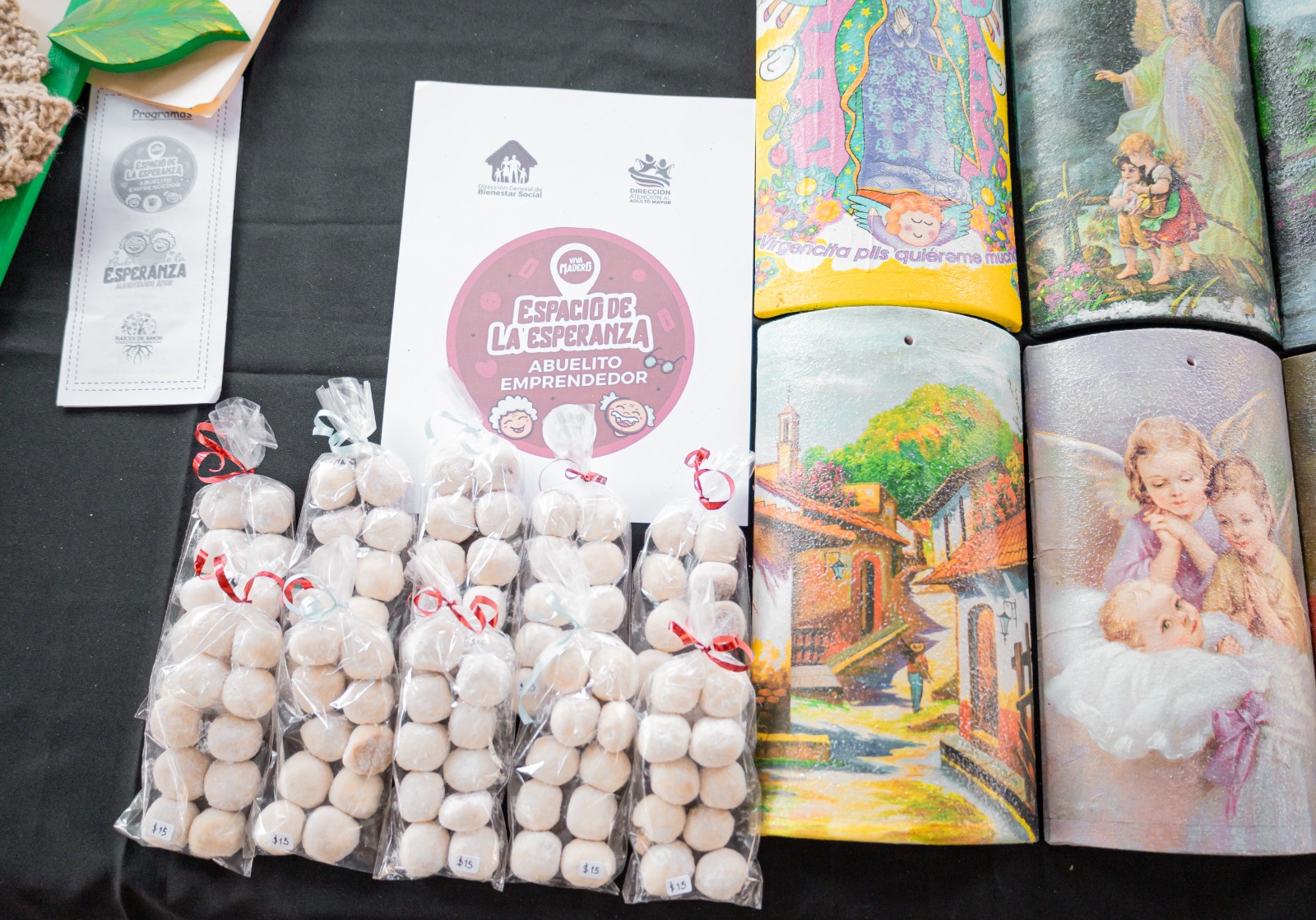 CIUDAD MADERO, Tam.- Abuelitos del Espacio de la Esperanza elaboraron diversas manualidades que son exhibidas y puestas a la venta en el Bazar del Día de las Madres, organizado por el Gobierno de Ciudad Madero, a través de la Dirección de Desarrollo Económico.