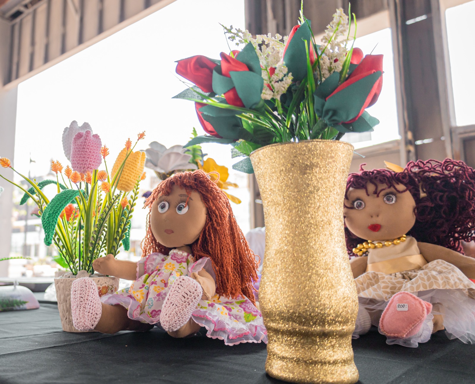 Bolsas tejidas, muñecas, flores, cuadros, tejas y repostería, forman parte de la exposición del grupo de 9 adultos mayores que asisten a las clases que ofrece la Dirección de Atención al Adulto Mayor en el Auditorio Municipal.