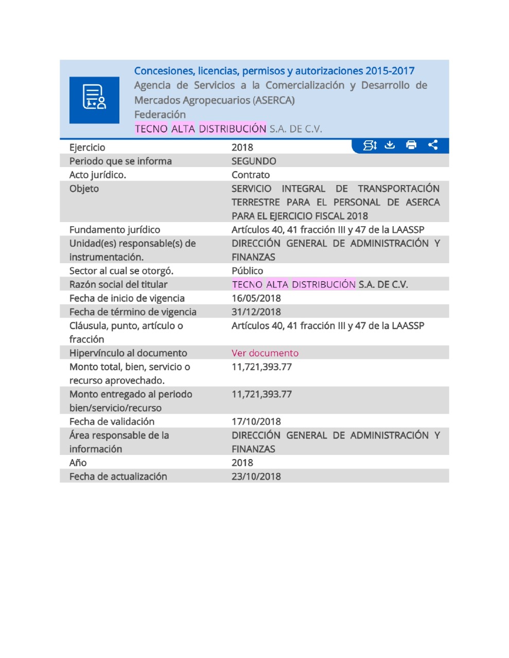 Tecno Alta Distribución recibió en los pasados años contratos de dependencias gubernamentales por unos mil millones de pesos, vía la prestación del servicio de arrendamiento y alquiler de vehículos. De acuerdo con la Plataforma Nacional de Transparencia, el IMSS le dio en febrero de 2016 un contrato inicial de $54 millones 916 mil 481.62, pero en el transcurso de ese mismo, se modificó y recibió $25 millones 008 mil 483.50 más, es decir 80 millones de pesos con adjudicación directa.