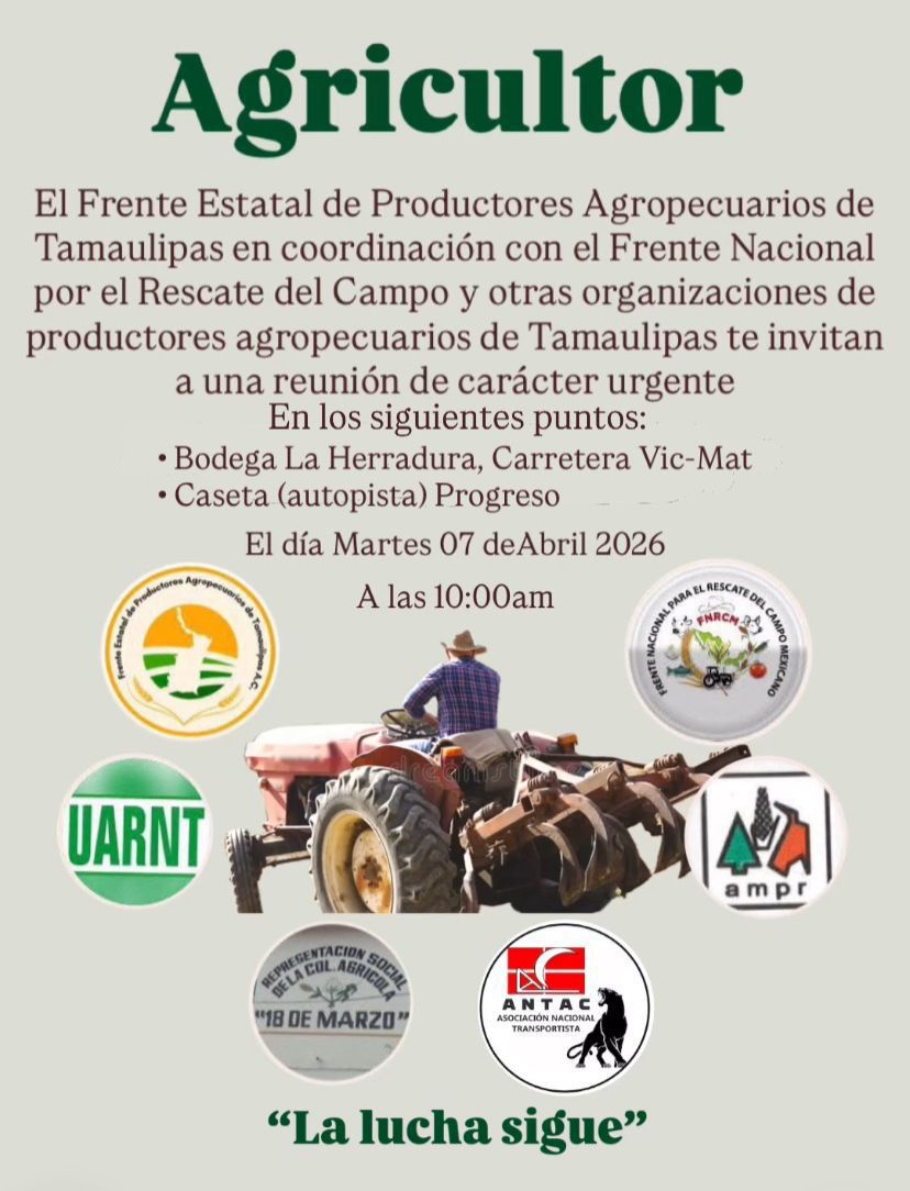 El Frente Estatal de Productores Agropecuarios de Tamaulipas anunció que mañana martes 7 de abril, continuarán las reuniones de carácter urgente en dos puntos carreteros del Estado: