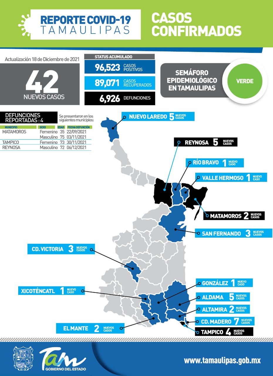 VICTORIA, Tam.- En su reporte diario sobre el estado de la pandemia, la Secretaria de Salud de Tamaulipas, Gloria Molina Gamboa confirmó 42 nuevos casos de COVID-19 y 4 fallecimientos, por lo que reiteró el llamado a reforzar las medidas de prevención ya conocidas para evitar una nueva ola de contagio o la circulación de la variante Ómicron.