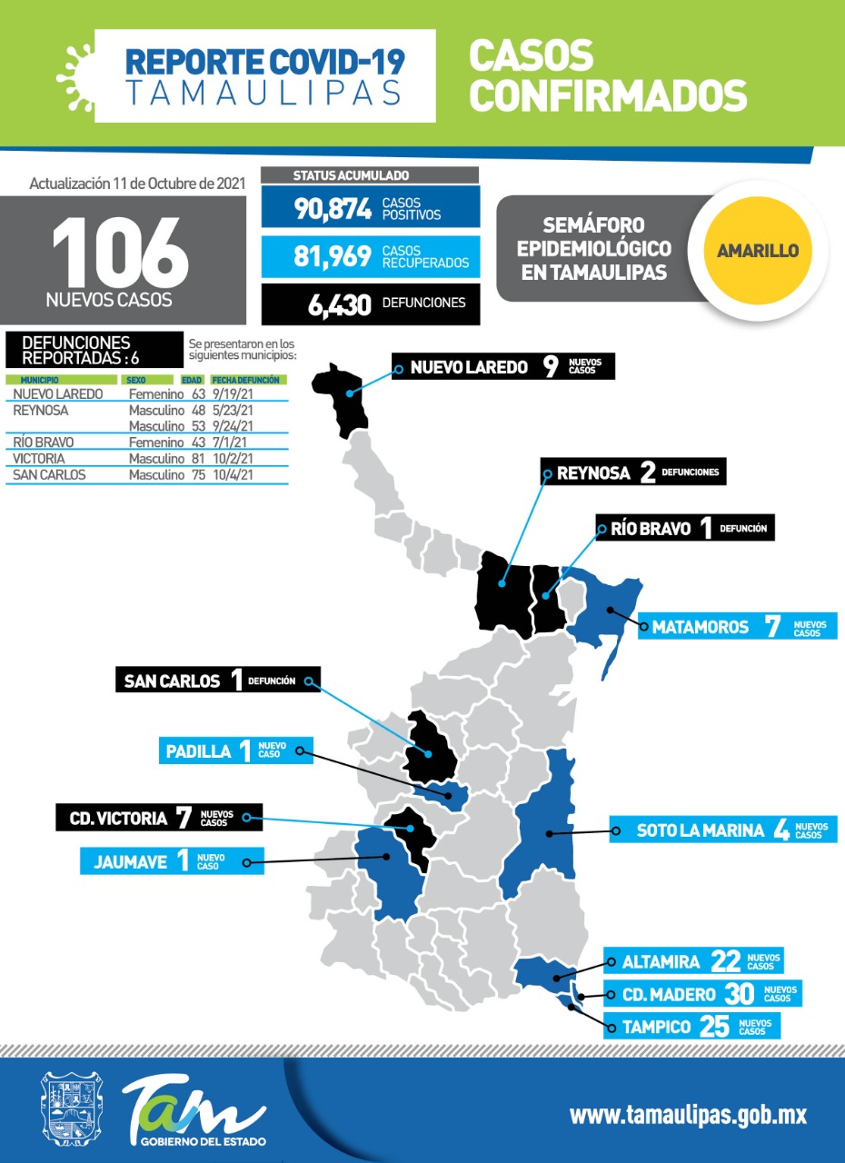 VICTORIA, Tam.- La secretaria de Salud de Tamaulipas, Gloria Molina Gamboa, informó que durante las últimas 24 horas se confirmaron 106 nuevos casos y 6 fallecimientos relacionados con el COVID-19.