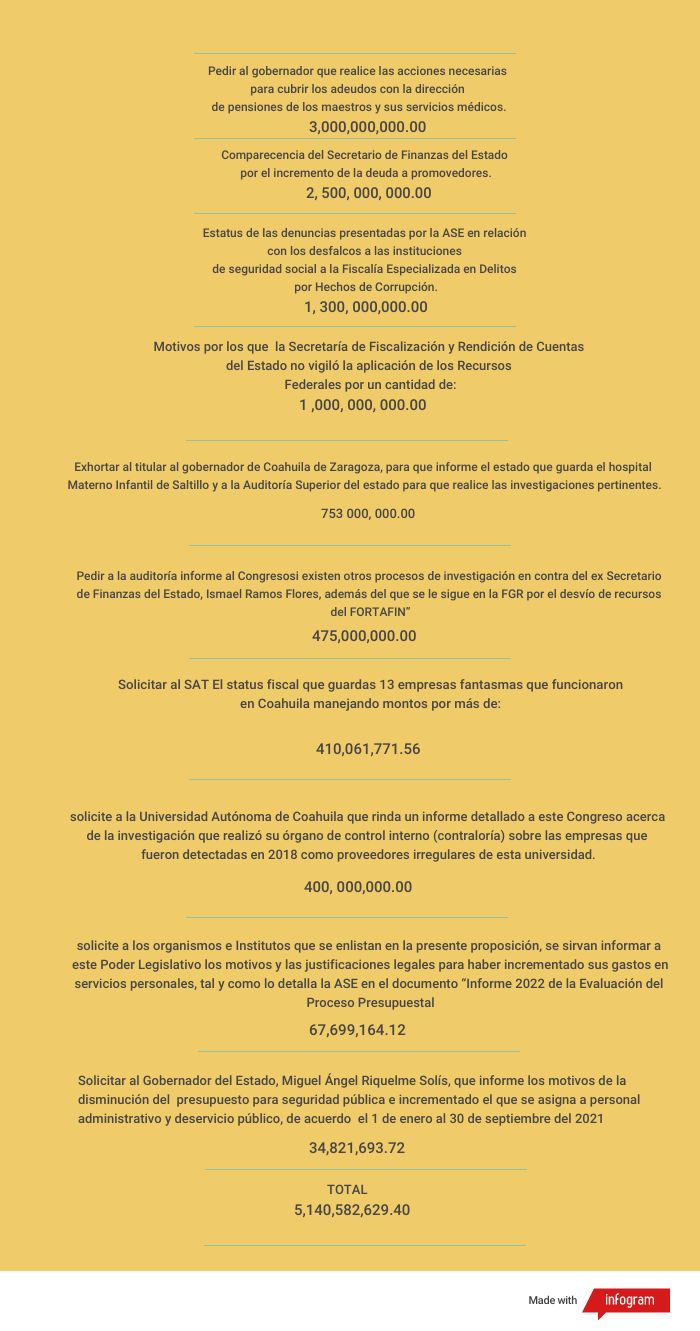 Dichos puntos van desde solicitar el estatus que guardan las denuncias realizadas por la Auditoría Superior del Estado a la Fiscalía Especializada en Delitos por Hechos de Corrupción, hasta pedir al Servicio de Administración Tributaria el estatus de 13 empresas fantasmas que operaron en Coahuila.