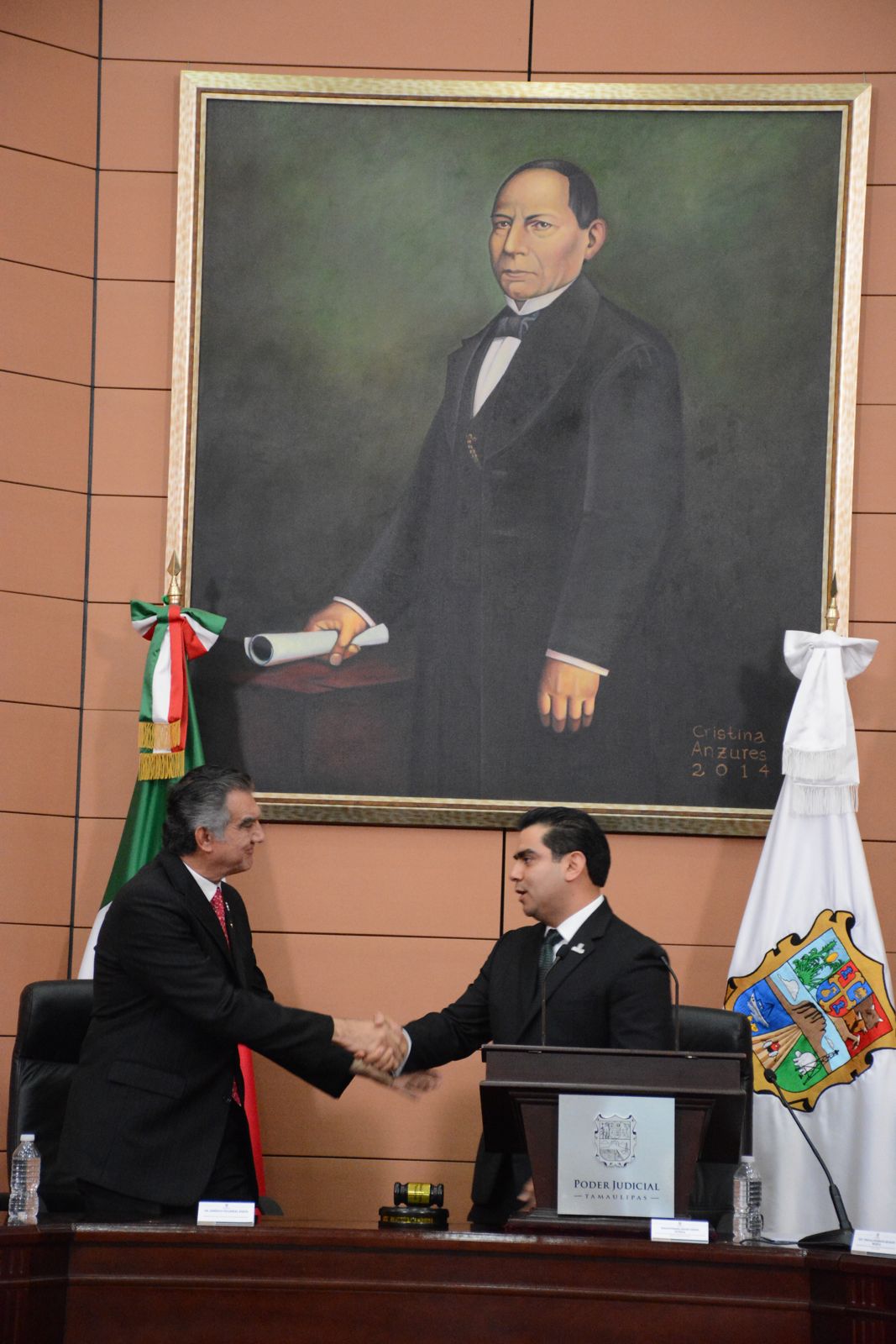 “Quiero reafirmarle nuestra contribución a ese propósito desde nuestra actualizada forma de administrar justicia para la consecución de la armonía y paz social. Cuente con nosotros señor gobernador, cuente con el Poder Judicial de Tamaulipas”, expresó.