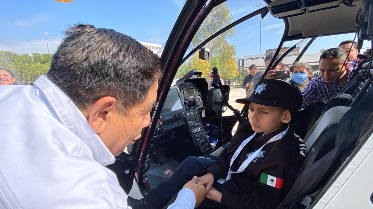 Al concluir la ceremonia, Cristo tuvo la oportunidad de subirse a un helicóptero, una motocicleta y una patrulla, además de recibir algunos regalos y las muestras de respeto y cariño de los elementos policiales.