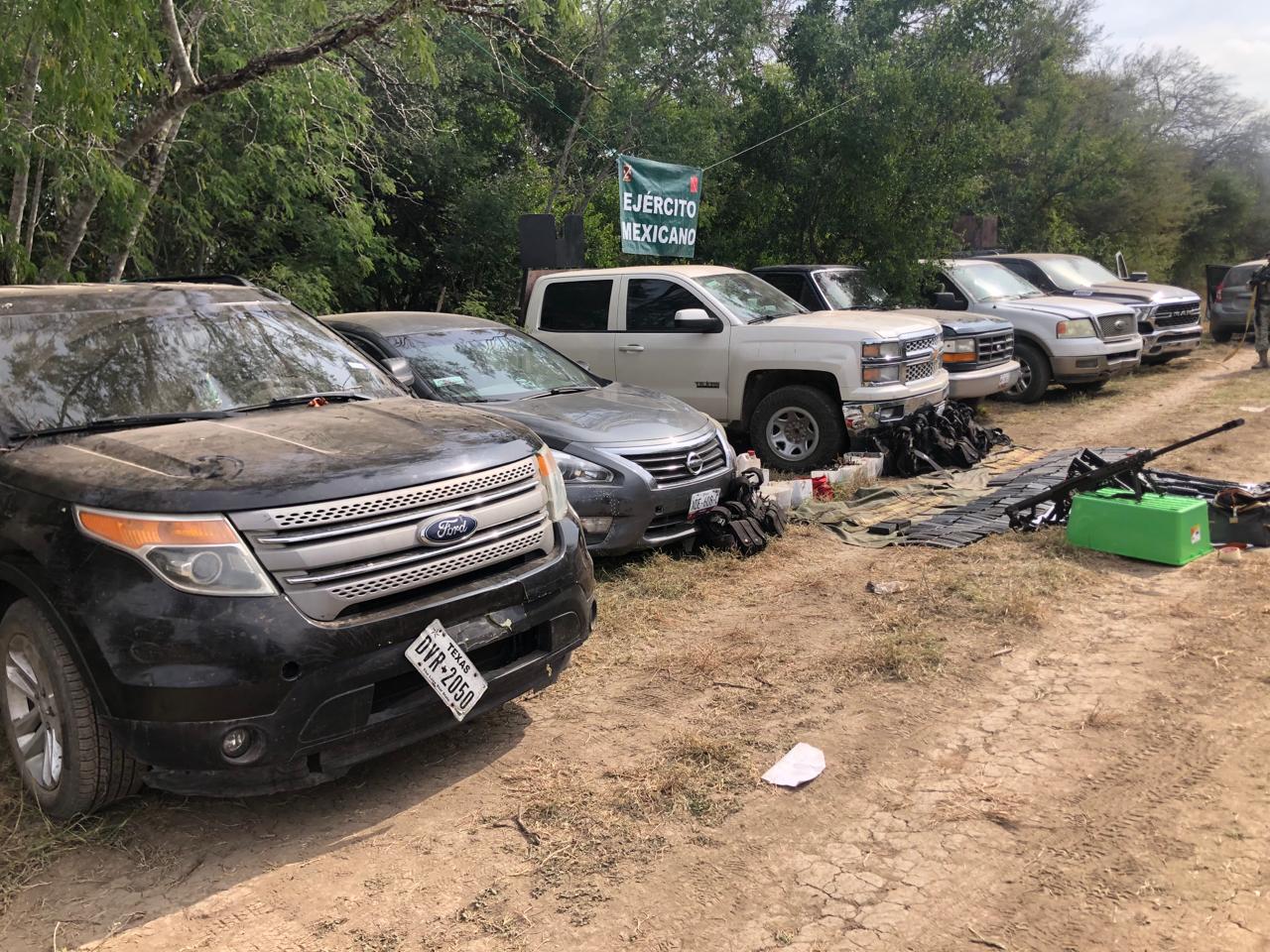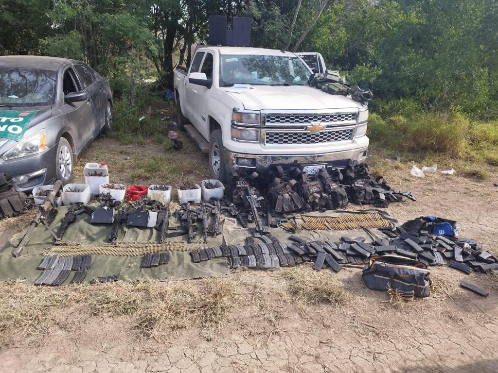 Mientras que en el municipio de Llera de Canales se lograron asegurar tres armas largas, R-15, M-4 y un Fusil Barret), así como ocho vehículos utilizados por los delincuentes, uno de ellos con blindaje artesanal.