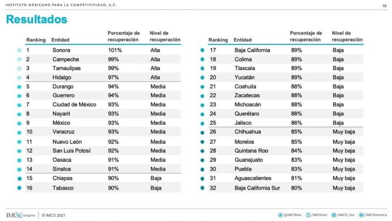 El estudio del IMCO define tres niveles de recuperación para los estados: