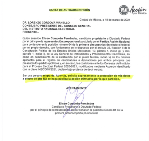 Un documento con el logo del Partido Acción Nacional y firmado el 18 de marzo del 2021 dice que, “bajo protesta de decir verdad”, el firmante era una “persona migrante”. El documento está a nombre de Eliseo Compeán Fernández, quien para ese momento ya había sido nombrado por el PAN como uno de sus candidatos a diputado federal plurinominal.