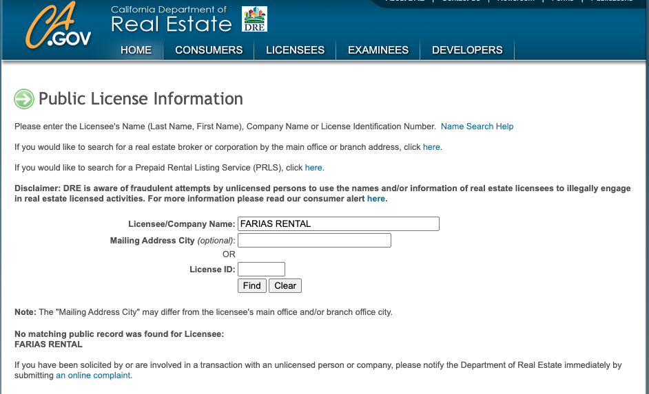 Más allá de la falta de pruebas en la queja, lo cierto es que de Farias Rental, la empresa arrendadora registrada en el contrato, no hay rastro en búsquedas específicas en internet. No hay rastro en redes sociales. No hay rastro en el registro público de empresas de California ni en el sistema de licencias del departamento de bienes raíces del estado. No hay rastro de ella en los 52 condados californianos. No, no hay rastro de la empresa.
