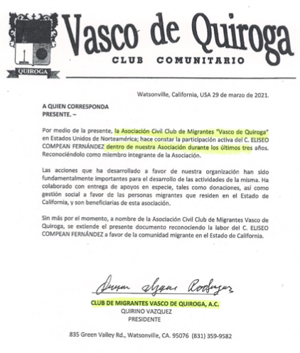 La segunda carta que Eliseo Compeán presentó al INE corresponde al club de migrantes Vasco de Quiroga AC, ubicado en la ciudad de Watsonville, en el condado de Santa Cruz, California.