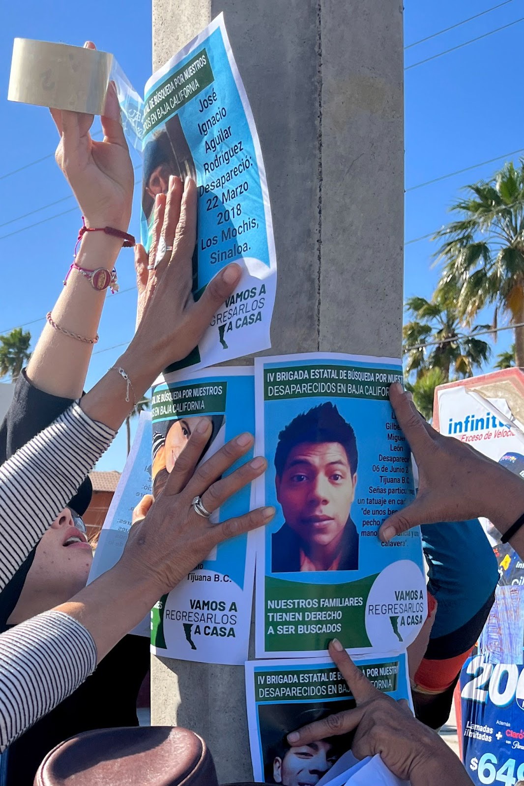La brisa marina dificulta la labor de un grupo de mujeres que intenta pegar en un poste de luz oxidado boletines de búsqueda de personas desaparecidas; una manipula la cinta adhesiva mientras sus compañeras sostienen las hojas de papel para que no se las lleve el viento; se mueven juntas, cual cardumen. Forman parte de la cuarta Brigada Estatal de Búsqueda de Desaparecidos, junto a participantes procedentes de una decena de estados del país. En este mediodía del jueves 20 de abril de 2023 recorren el muelle del puerto de San Felipe, donde hay poco movimiento: tan solo unas embarcaciones encalladas, un oleaje taciturno, un par de pescadores que entran y salen de un depósito de cerveza y que, cuando ven al grupo pegar sus boletines, evitan cualquier interacción.