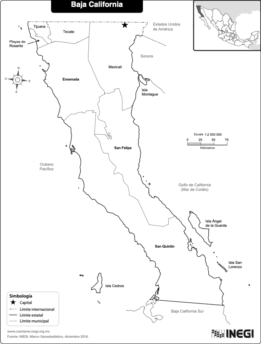Este mapa de Baja California fue modificado por Elementa DDHH para mostrar cómo quedó dividido el estado después de que San Felipe se convirtió en su séptimo municipio en enero de 2022. (Elementa DDHH).