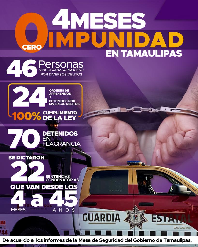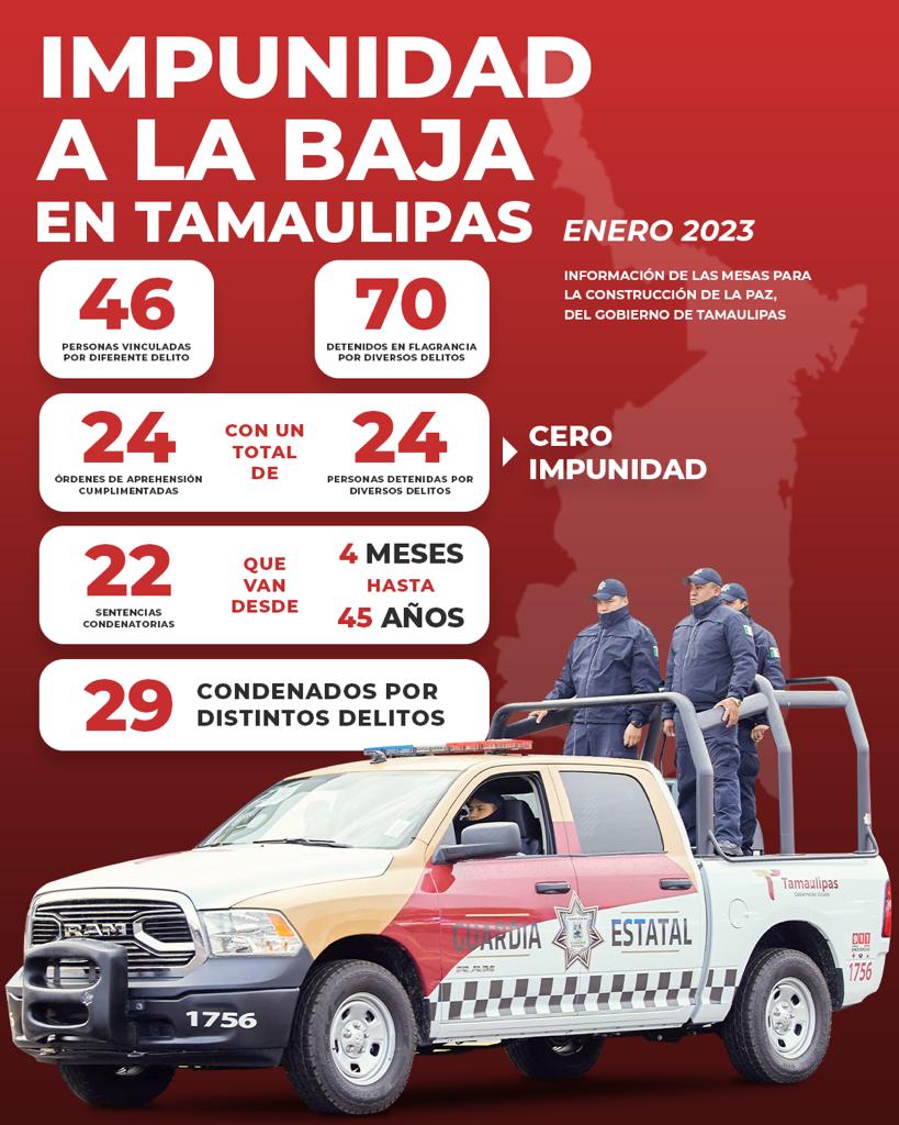 VICTORIA, Tam.- Tamaulipas avanza en el combate a fondo de la impunidad, de acuerdo con el informe de las Mesas de Seguridad en Tamaulipas, que detalla que en enero más 90 personas fueron detenidas por diversos delitos.
