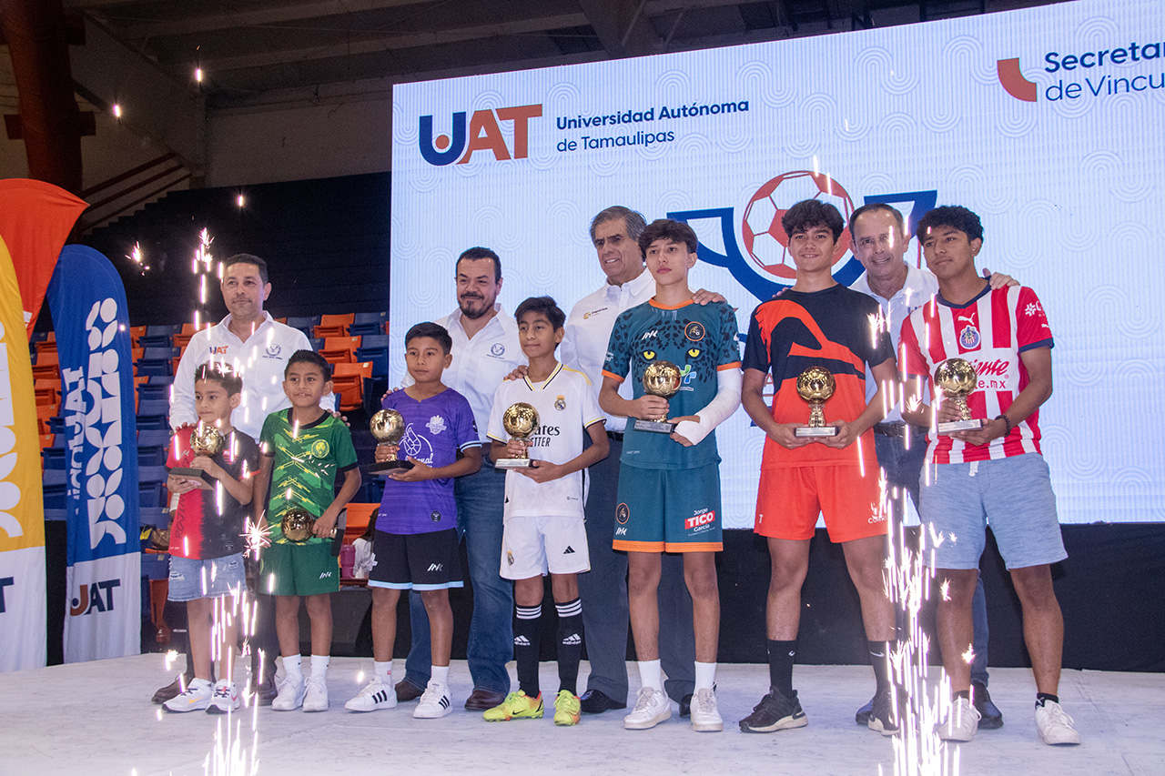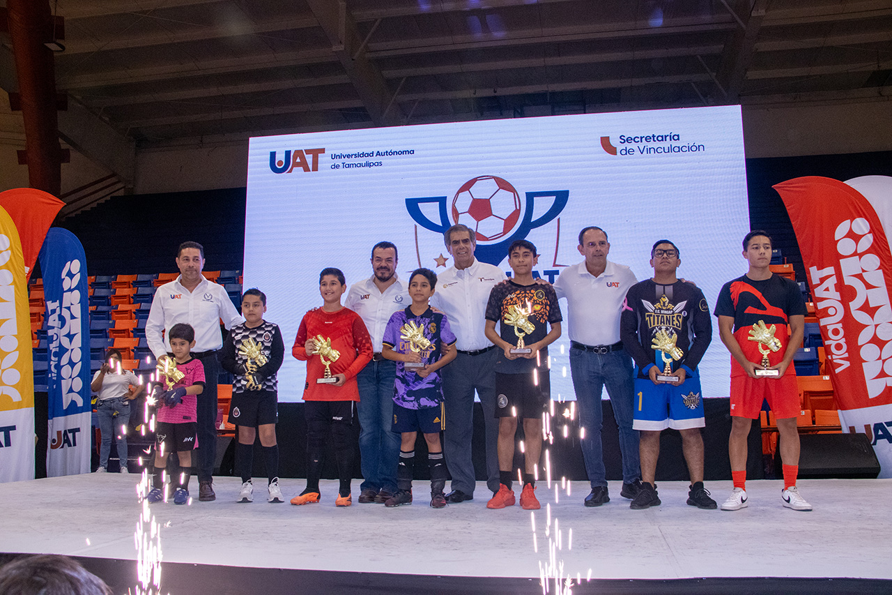 VICTORIA, Tam.- El Rector de la Universidad Autónoma de Tamaulipas (UAT), Guillermo Mendoza Cavazos, presidió la ceremonia de premiación del torneo de fútbol infantil y juvenil “Copa UAT”, que en su edición número 39 logró una gran convocatoria de equipos participantes en Ciudad Victoria.