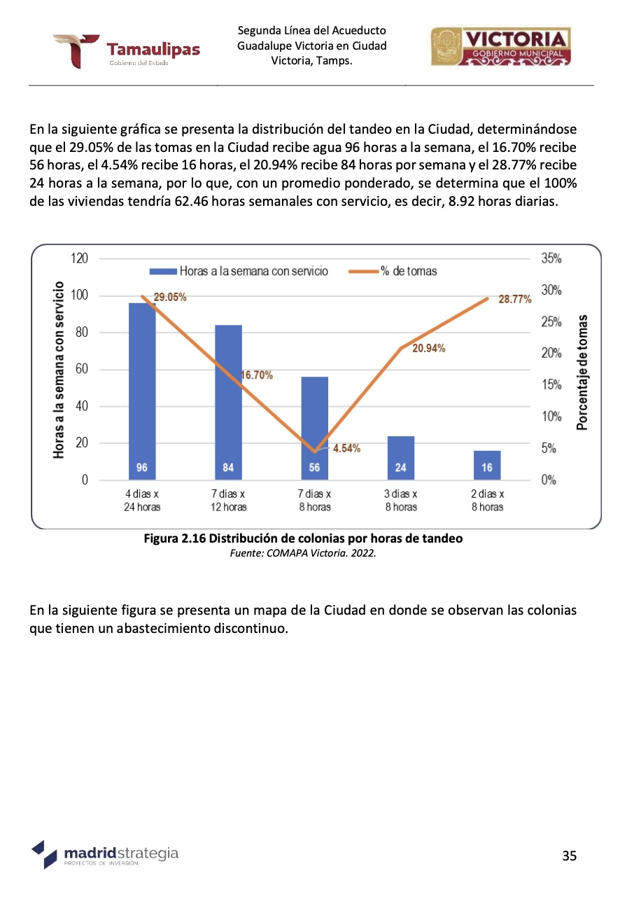 De acuerdo con el análisis costo beneficio del proyecto de la segunda línea del acueducto Guadalupe Victoria en Victoria, se determinó que con los tandeos actuales, del 100 por ciento de las viviendas tendrían 62.46 horas semanales con servicio, esto es 8.92 horas diarias.