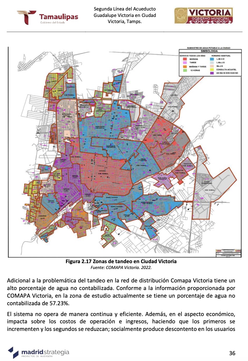 La información está contenida en el análisis costo-beneficio del proyecto “Segunda Línea del Acueducto Guadalupe Victoria en Ciudad Victoria, Tam”, elaborado por “Madrid Estrategia” para el Gobierno de Tamaulipas y el Ayuntamiento de Victoria, entregado a la Secretaría de Hacienda y Crédito Público.