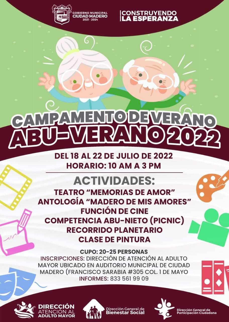 CIUDAD MADERO, Tam.- Con el debido protocolo sanitario, adultos mayores disfrutarán de diversas actividades recreativas y artísticas que el Gobierno de Ciudad Madero prepara para la temporada vacacional, dentro del Campamento de Verano “Abu-Verano” 2022.