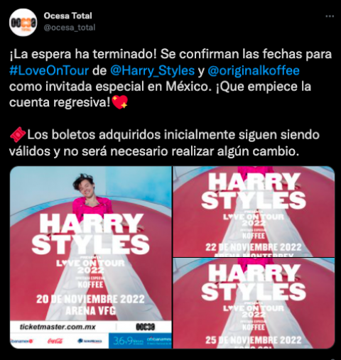 Styles se presentará en la Arena VFG de Guadalajara el domingo 20 de noviembre, en la Arena Monterrey el 22 de noviembre y en el Foro Sol de la Ciudad de México el 25 de noviembre.