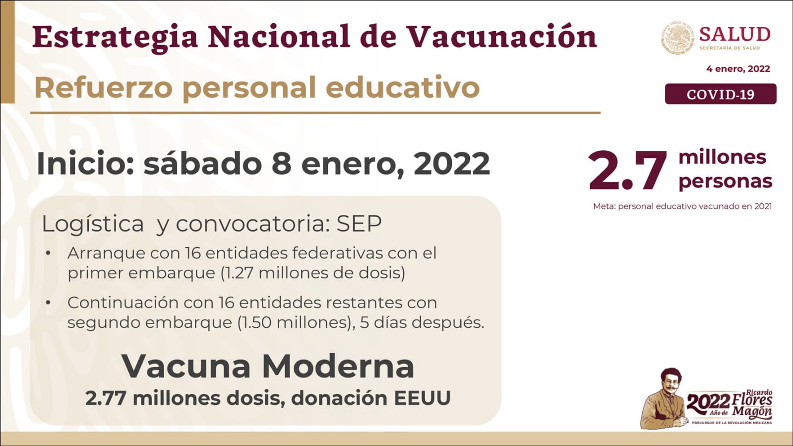 El titular de la Secretaría de Salud a nivel federal indicó que el personal educativo que representa 2.7 millones de personas recibirán el fármaco del laboratorio estadounidense Moderna.