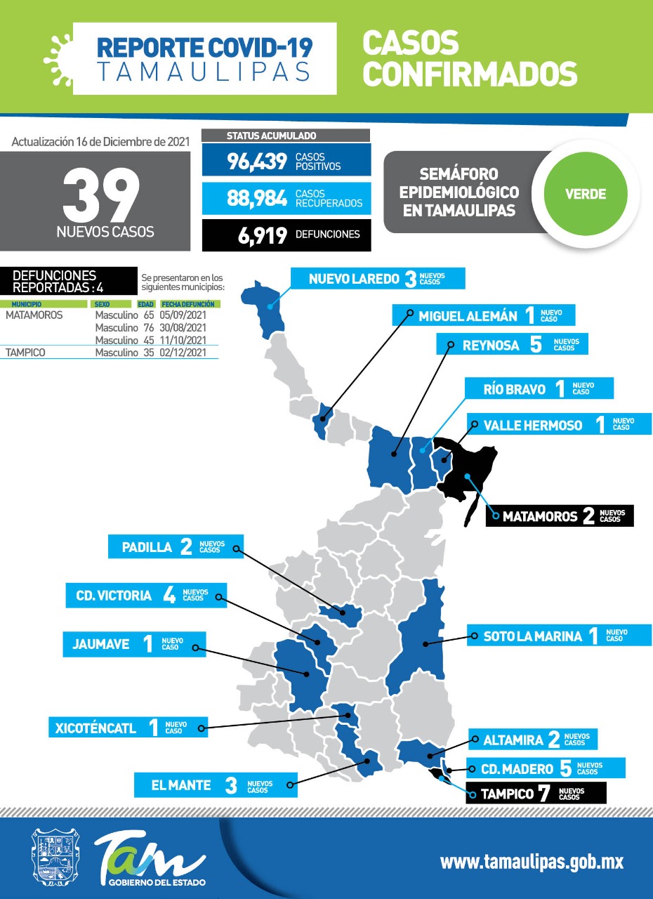 VICTORIA, Tam.- Tamaulipas cerró la jornada de este jueves con 39 pacientes positivos a COVID-19 y 4 fallecimientos asociados a complicaciones graves por el virus, informó la secretaria de Salud, Gloria Molina Gamboa al reiterar su llamado a ser ciudadanos socialmente responsables y aprender lo que más de 20 meses de pandemia han impactado en la población para evitar una cuarta ola de contagios.