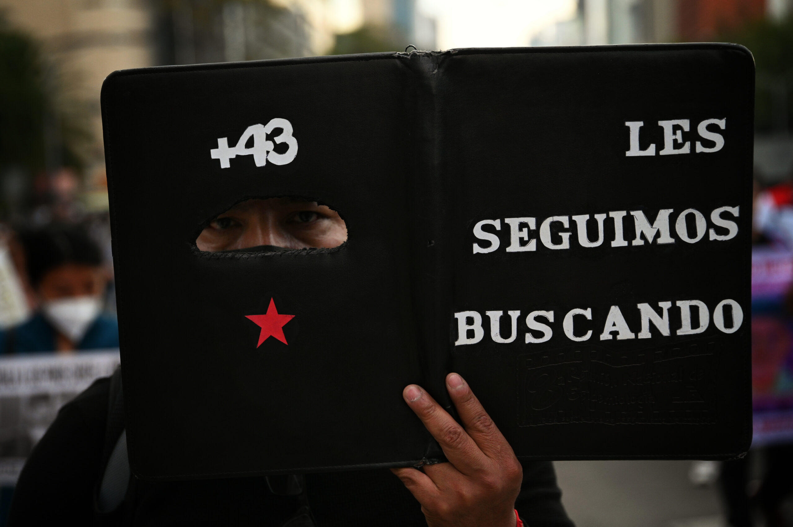Un participante en la marcha organizada hace dos años en la Ciudad de México para conmemorar el séptimo aniversario de la desaparición de los jóvenes. (Mayolo López Gutiérrez/ObturadorMX).