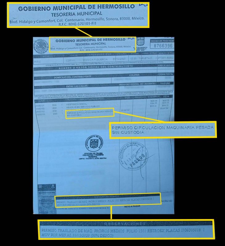 El 13 de enero de 2020, un particular pagó en Tesorería municipal un permiso anual para el traslado de una retroexcavadora, considerada como maquinaria pesada e identificada con las placas JJG0305018.