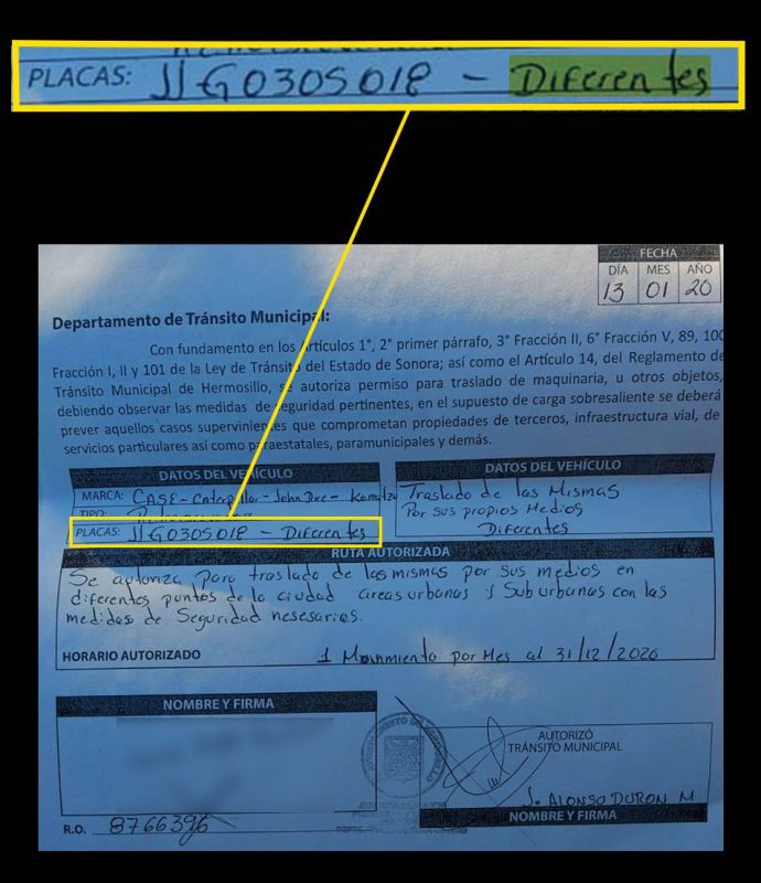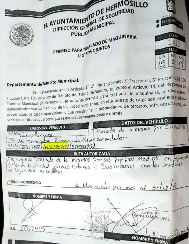 En este caso, el permiso contaba también con la firma de Jesús Alonso Durón Montaño, jefe del departamento de Tránsito de Hermosillo, así como con un sello de la corporación.