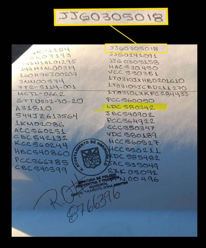 Al permiso oficial, firmado por el director de tránsito, se anexa un tercer documento fuera del procedimiento normal, que lleva un sello de la Policía Municipal: se trata de una hoja que incluye -además de las placas del vehículo por el que se hizo el pago- otras más que no fueron autorizadas mediante una transacción en Tesorería.