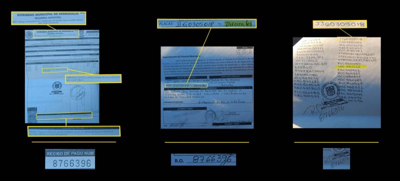 El Malpensado tuvo acceso a un permiso expedido por el Departamento de Tránsito que corresponde a los datos del recibo de pago #8766396. En el campo en el que se registran los datos del vehículo se leen las placas JJG0305018, seguidas de un guión y la palabra “diferentes”, refiriéndose a que el permiso cubre otras unidades. Tiene, además, un sello del Ayuntamiento de Hermosillo, con identificación del Departamento de Tránsito, se aprecia también una firma y el nombre de J. Alonso Durón M.