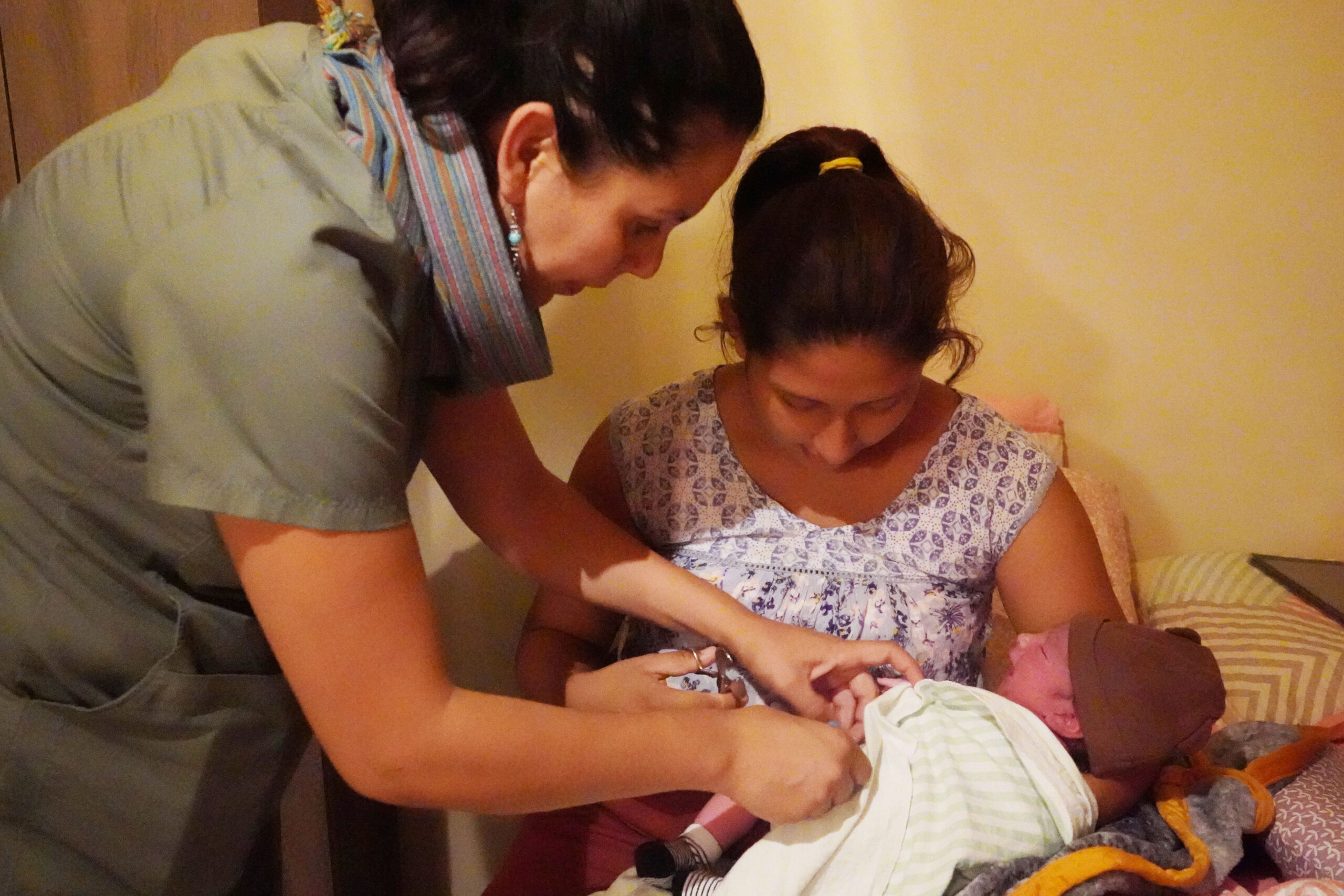 Daniela, migrante salvadoreña, acaba de dar a luz a Milán, su tercer hijo en Tijuana, asistida por Ximena Rojas, partera y fundadora de Partería y Medicinas Ancestrales. Foto: Alicia Fernández.