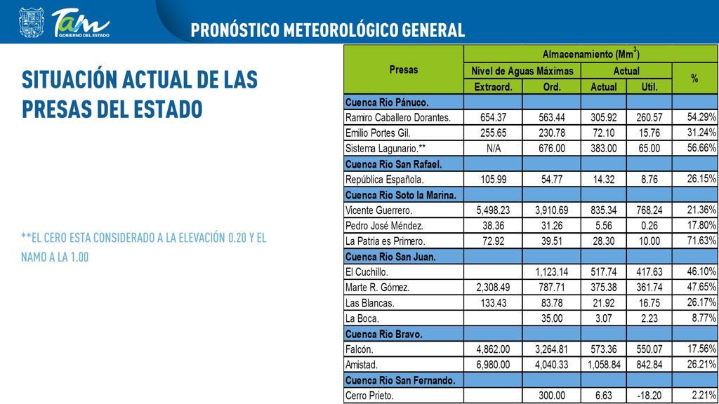Las principales presas de la entidad, registran niveles muy bajos, con un descenso importante, como es el caso de la “Vicente Guerrero” que registra 21.36 por ciento de capacidad y la “Marte R. Gómez” en el municipio de Camargo un 47.65 por ciento de su capacidad, siendo esta la única en la entidad que cuenta con una capacidad de abasto de agua por arriba del resto de las ubicadas en la entidad.