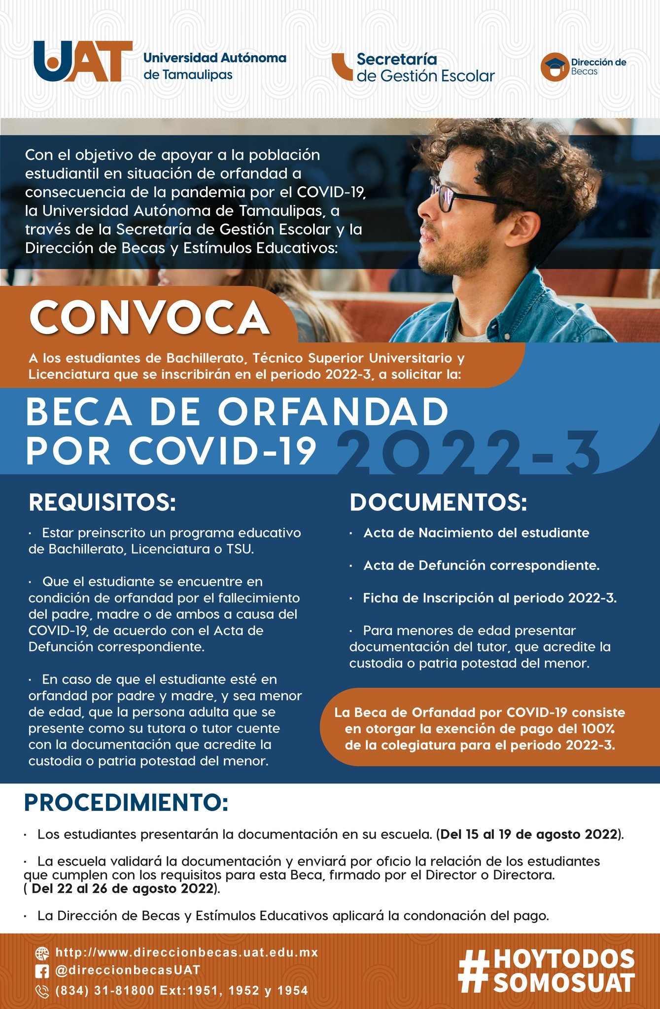 La convocatoria emitida a través de la Dirección de Becas y Estímulos Educativos de la Secretaría de Gestión Escolar de la UAT, corresponde al período escolar 2022-3 de esta casa de estudios, y busca brindar un apoyo a la población estudiantil en situación de orfandad a consecuencia de la pandemia.