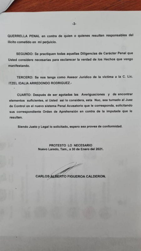 NUEVO LAREDO, Tam., 30 de enero.- El corresponsal del periódico La Jornada de México en Nuevo Laredo, Carlos Figueroa Calderón, interpuso una querella ante el Agente del Ministerio Público del Estado en contra de la diputada plurinominal por Morena, Carmen Lilia Canturosas Villarreal por el delito de amenazas.