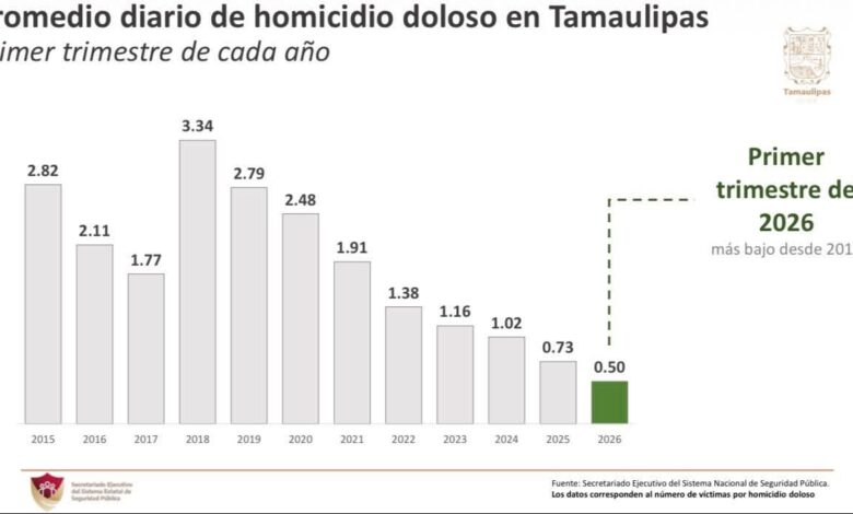 El Secretariado Ejecutivo del Sistema Nacional de Seguridad Pública detalló que durante el primer trimestre de 2026, Tamaulipas consolidó esta tendencia a la baja, la cual se ha registrado desde el inicio de la actual administración estatal.
