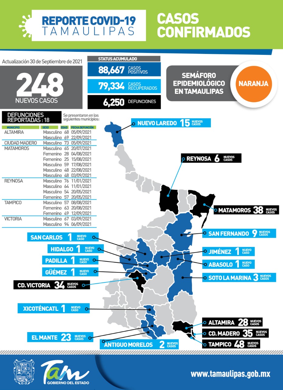VICTORIA, Tam.- La pandemia de COVID-19 sumó este jueves 248 nuevos casos y 18 fallecimientos, informó desde esta ciudad capital, la secretaria de Salud, Gloria Molina Gamboa luego de pedir a la ciudadanía atender en todo momento medidas preventivas como el uso del cubrebocas, el lavado frecuente de manos y la sana distancia.