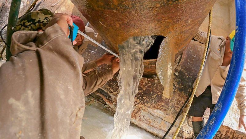 El trabajo consistió en soldar un tubo a media caña para reparar el orificio de 35 centímetros de diámetro y el reforzamiento de la tubería desgastada, que además de la fuga causó daños en una caja de válvulas, misma que será repara en los próximos días.