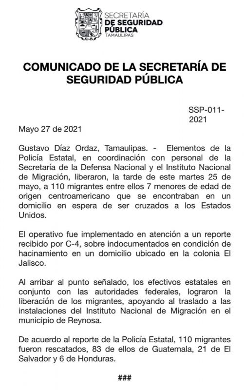 GUSTAVO DÍAZ ORDAZ, Tam.- Elementos de la Policía Estatal, en coordinación con personal de la Secretaría de la Defensa Nacional y el Instituto Nacional de Migración, liberaron, la tarde de este martes 25 de mayo, a 110 migrantes entre ellos 7 menores de edad de origen centroamericano que se encontraban en un domicilio en espera de ser cruzados a los Estados Unidos.