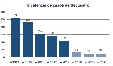 Los resultados representan una disminución de más de 130 secuestros al año, desde el 2016 al 2021; los registros del 2019, 2020 y 2021 muestran una reducción de 83% en relación con los tres años anteriores, 2016, 2017 y 2018, lo cual nos habla de un promedio de menos de 25 casos por año y de 2 al mes.