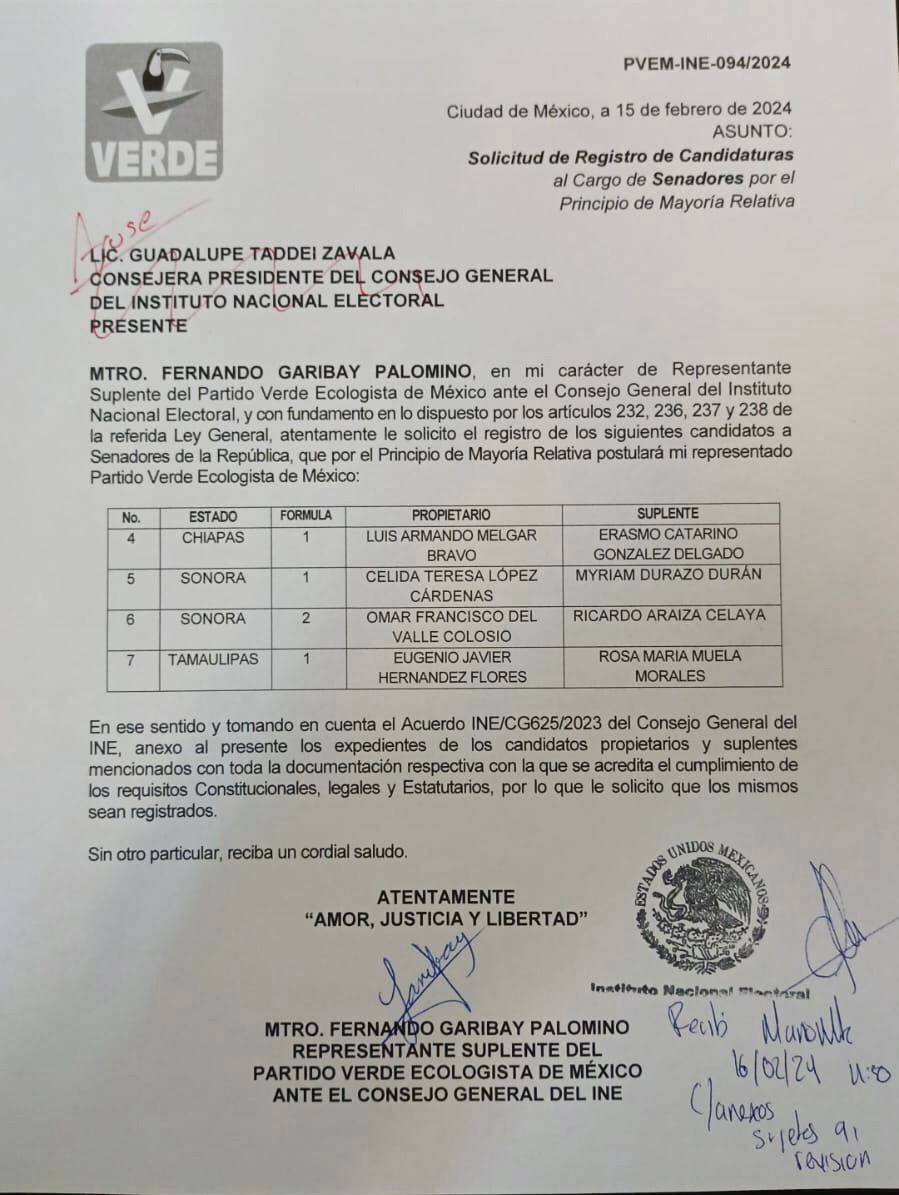 VICTORIA, Tam.- El Partido Verde Ecologista de México solicitó al Instituto Nacional Electoral (INE), el registro del ex gobernador Eugenio “Geño” Hernández Flores como candidato al Senado por Tamaulipas.