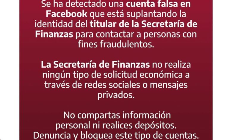 VICTORIA, Tam.- La Secretaría de Finanzas de Tamaulipas advirtió a la población sobre la detección de una cuenta falsa en Facebook que intenta hacerse pasar por el titular de la dependencia con el objetivo de contactar a ciudadanos y cometer posibles fraudes.